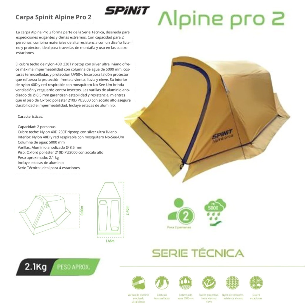 Ideal para quem não abre mão de qualidade, segurança e conforto em suas expedições de alta montanha ou uso durante as quatro estações. A Carpa Spinit Alpine Pro 2 é a escolha certa para aventureiros que buscam resistência e praticidade em um único equipamento.