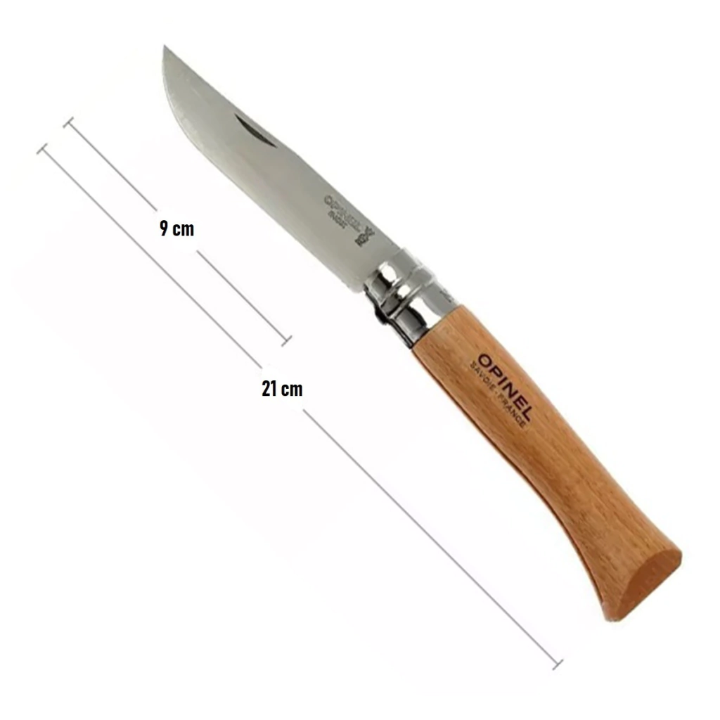 -Mango : La haya es la madera más utilizada para la fabricación de los mangos de Opinel. Proviene de explotaciones francesas, es dura, resistente y fácil de trabajar. Con un aspecto homogénero, su color clara varía del amarillo al rosado. Es fácilmente reconocible por la presencia de varios trazos oscuros. El mango barnizado está protegido de las manchas y la humedad.
