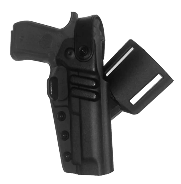 El sistema rotativo permite dar el angulo adecuado según el usuario y su postura; ademas, permite montar y desmontar el arma quedando solo el pasacinturón en el correaje. Así mismo, la funda permite controlar el nivel de retención deseado.