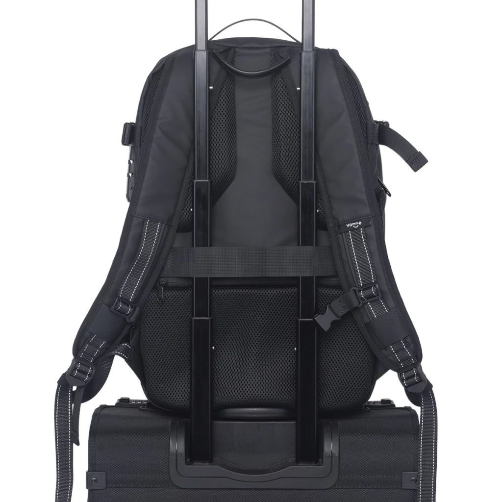 Hebilla de soporte en el pecho y correa en espalda para sujetar la mochila a equipajes de mano (carry on).