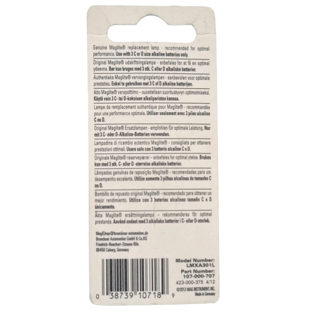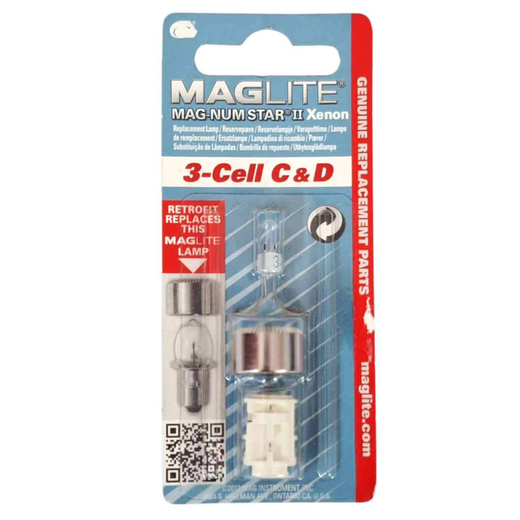 Descripción Técnica: Bombillo de repuesto original Maglite®-recomendado para obtener un mejor rendimiento. Utilice con 3 baterías alcalinas tamaño C & D únicamente. Siempre que sea posible, utilice repuestos y accesorios Mag-Lite para obtener el máximo rendimiento de este producto. Caracterisitcas: - Marca: Maglite. - Modelo: 3-Cell C & D. - Número de modelo del artículo: LMXA301L - Tipo de bombillo: Xenom - Contiene: 1 Bombilla - Compatibilidad de baterías: 3 baterías alcalinas de tamaño C o D - Lámparas de repuesto: Compatibilidad MAGLITE MAG-NUM STAR II